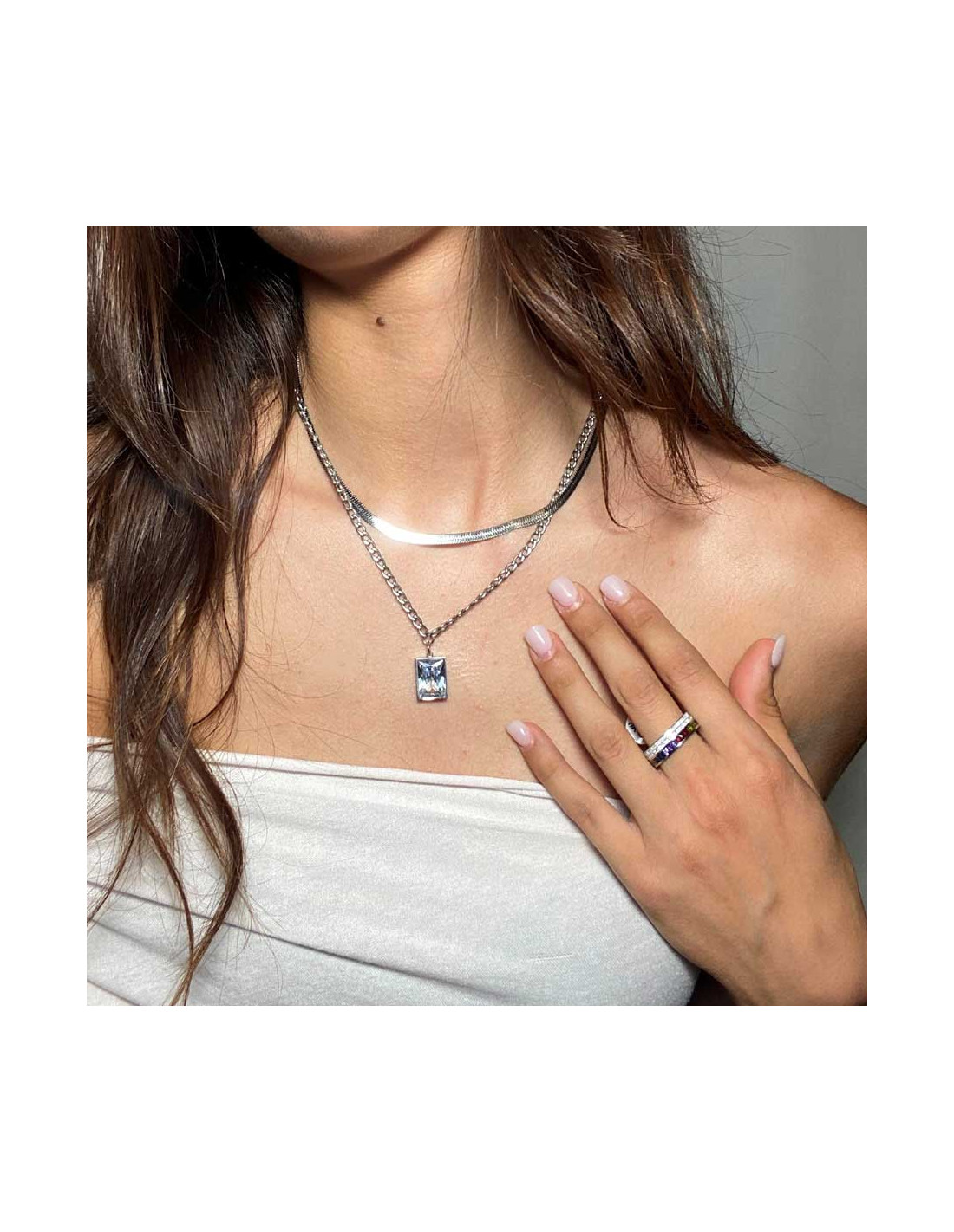 Αυτό το κομψό, Ολόβερο δαχτυλίδι είναι κατασκευασμένο από ατσάλι και διαθέτει δύο σειρές μικρών διαφανών κρυστάλλων. Στο κέντρο του, υπάρχει μια σειρά από πολύχρωμες πέτρες σε τετράγωνο κόψιμο, δημιουργώντας μια εντυπωσιακή αντίθεση με τη λαμπερή ατσάλινη βάση του, προσδίδοντας στυλ και πολυτέλεια.