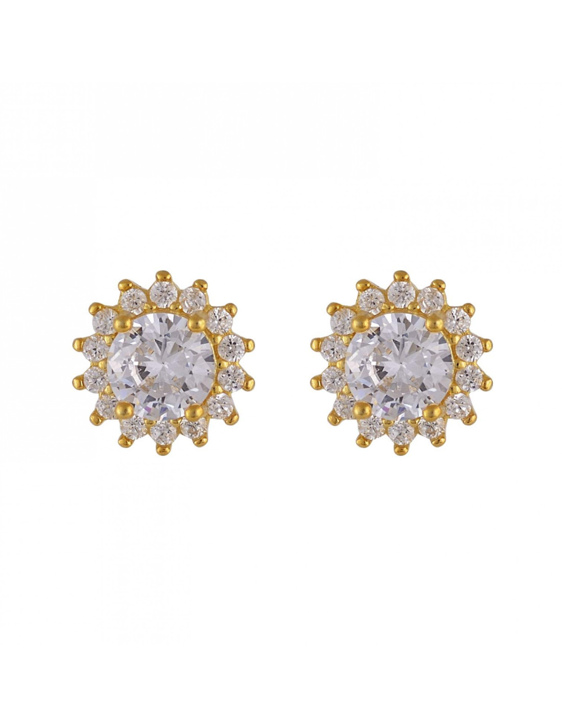 Εντυπωσιακά σκουλαρίκια Ροζέτα, καρφωτά σε χρυσό τόνο, διακοσμημένα με λαμπερή κεντρική πέτρα κοπής μπριγιάν, που περιβάλλεται από μικρότερες πέτρες σε σχήμα λουλουδιού. Ο κομψός σχεδιασμός τους χαρίζει διαχρονική φινέτσα και λάμψη, ιδανική για καθημερινές εμφανίσεις αλλά και για ιδιαίτερες περιστάσεις με στυλ